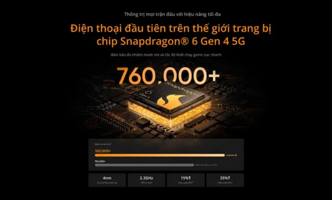 Được sản xuất trên tiến trình 4nm tiết kiệm điện năng hàng đầu trong phân khúc, Snapdragon 6 Gen 4 ghi nhận điểm hiệu năng Antutu lên đến 760.000 – một con số đầy ấn tượng đối với dòng máy tầm trung. Chipset này cải thiện 11% sức mạnh CPU (so với thế hệ chip trước) với kiến trúc tám nhân hiện đại (Cortex-A720 và Cortex-A520), đồng thời tăng cường 29% khả năng xử lý đồ họa của GPU, mang đến trải nghiệm hình ảnh sắc nét và mượt mà hơn. Không chỉ mạnh mẽ về phần cứng, Snapdragon 6 Gen 4 còn tích hợp loạt công nghệ tiên tiến khác giúp từng trận chiến trong game trở nên sống động, mượt mà và phản hồi nhanh hơn, kể cả trên một thiết bị tầm trung.