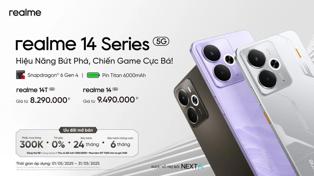 Bộ đôi smartphone chơi game phân khúc thị trường tầm trung realme 14T 5G và realme 14 5G đã được realme ra mắt ở Việt Nam trong sự kiện “Hiệu năng bứt phá, Chiến game cực bá” tổ chức tại TP.HCM chiều 24-4-2025. Cả hai có pin Titan dung lượng “khủng” 6.000mAh hỗ trợ sạc nhanh 45w. Riêng realme 14 5G là mẫu điện thoại đầu tiên trên thế giới được trang bị vi xử lý Snapdragon 6 Gen 4 (4nm). realme Việt Nam gọi đây là bộ đôi “Bậc thầy Chiến game”.