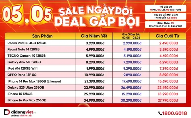 Hệ thống bán lẻ hàng công nghệ Di Động Việt triển khai chương trình “Sale ngày đôi – Deal gấp bội” diễn ra từ ngày 3-5 đến ngày 5-5-2025 với hàng loạt ưu đãi sâu cho nhiều thiết bị công nghệ hot nhất hiện nay. Trong đợt ưu đãi áp dụng trên toàn hệ thống này, khách hàng càng đến sớm càng có thể tận hưởng nhiều deal hời.