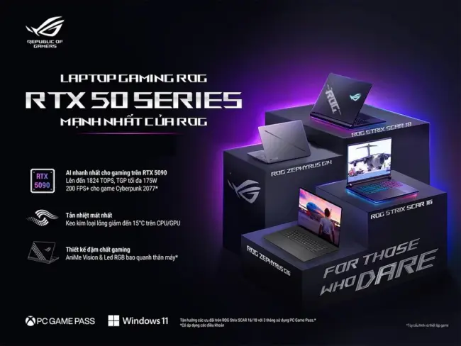 Các dòng laptop gaming ROG trang bị GPU NVIDIA RTX 50 Series mạnh nhất, cụ thể gồm các GPU RTX 5090, RTX 5080 và RTX 5070Ti, được mở bán tại thị trường Việt Nam từ ngày 7-5-2025 với nhiều phiên bản cấu hình khác nhau.