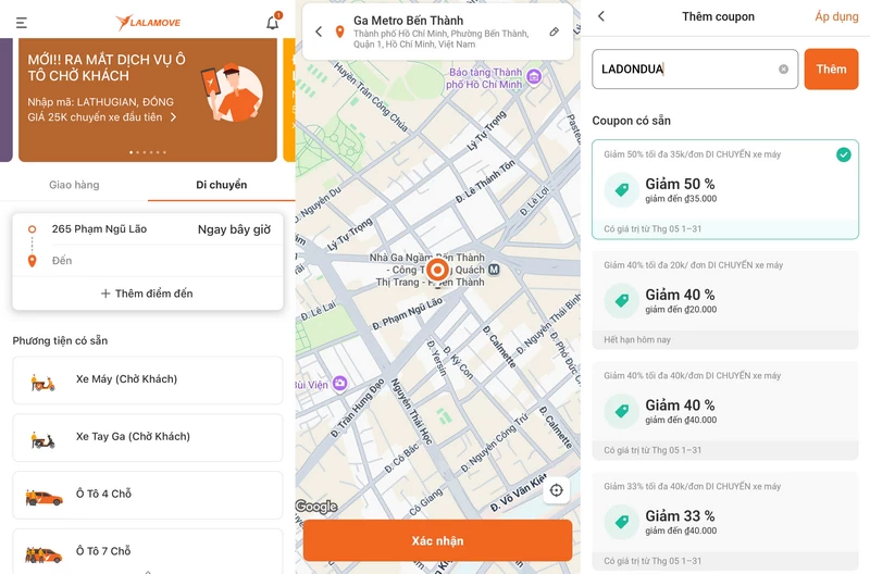 Dịch vụ đặt xe chở khách đã chính thức được tích hợp trên ứng dụng Lalamove. Chỉ với vài thao tác, khách hàng có thể sử dụng đồng thời dịch vụ giao hàng lẫn đặt xe đưa đón. Đặc biệt, Lalamove đang dành tặng nhiều ưu đãi cho khách hàng sử dụng dịch vụ di chuyển khi giảm 50% (tối đa 35.000đ) đối với xe máy và giảm 50% (tối đa 50.000đ) đối với xe ô tô khi nhập mã LADONDUA.