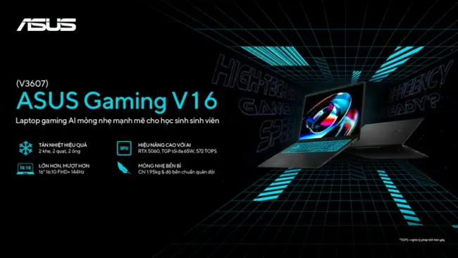 ASUS Việt Nam ngày 3-6-2025 cho biết: ASUS vừa ra mắt người dùng ở Việt Nam chiếc laptop gaming AI mỏng nhưng mạnh mẽ ASUS Gaming V16 ((V3607/K3607). Laptop chơi game này được trang bị vi xử lý Intel Core 7 processor 240H hay Intel Core 5 processor 210H và Laptop GPU NVIDIA GeForce RTX 5060 hay GeForce RTX 4050. Máy gây ấn tượng với lớp vỏ đen mờ sang trọng, tinh tế; viền máy được điểm xuyến bằng họa tiết chéo cùng logo ASUS ở nắp máy, tạo nên vẻ ngoài đơn giản, nhưng đầy cá tính.