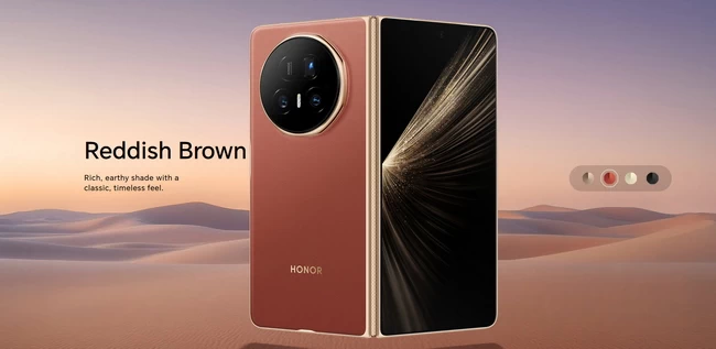 HONOR Magic V5 có bốn màu: Trắng Ngà (Ivory White), Đen (Black), Vàng (Dawn Gold), và Nâu Đỏ. (Reddish Brown).