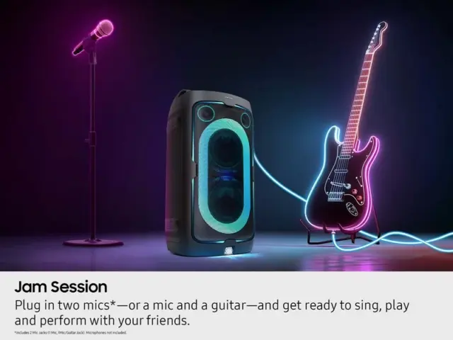 Để tăng thêm phần hứng khởi, loa tháp di động còn tích hợp DJ Booth, tạo hiệu ứng khuếch đại giọng hát trong chế độ karaoke với micro và cổng cắm guitar – biến mọi không gian thành sân khấu sống động với sự kết hợp giữa âm thanh mạnh mẽ và ánh sáng bắt mắt. Do đó, thiết bị còn phù hợp cho những buổi karaoke gia đình, giúp mỗi thành viên có thể tỏa sáng với giọng hát vang lên rõ ràng.