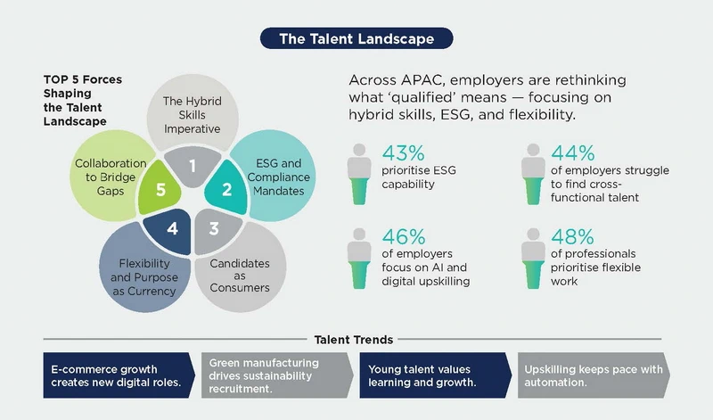 Nhiều doanh nghiệp tiếp tục đối mặt với tình trạng thiếu hụt nhân lực chất lượng cao, khi nhu cầu về kỹ năng số, năng lực phân tích dữ liệu và các kỹ năng kết hợp linh hoạt tăng nhanh hơn nhiều so với nguồn cung tại hầu hết các thị trường lớn. Đồng thời, kiến thức về ESG và khả năng tuân thủ cũng trở thành tiêu chí tuyển dụng quan trọng, trong bối cảnh các tổ chức phải đáp ứng yêu cầu bền vững ngày càng cao.