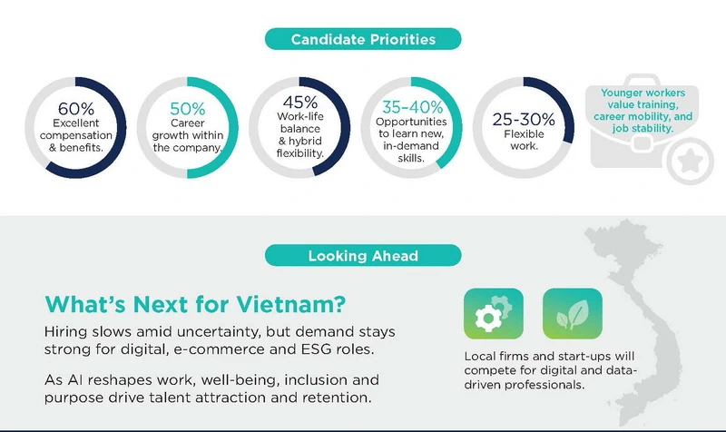 Khi các kỹ năng số hóa như phân tích dữ liệu, trí tuệ nhân tạo (AI), năng lực kết hợp công nghệ – chiến lược (hybrid skills) cùng hiểu biết ESG (Environmental – môi trường, Social – xã hội, Governance – quản trị doanh nghiệp) trở nên khan hiếm, người lao động lại chuyển trọng tâm sang môi trường linh hoạt, cơ hội phát triển và định hướng nghề nghiệp dài hạn. Sự dịch chuyển này đang buộc doanh nghiệp xem xét lại chính sách thu hút và giữ chân nhân tài.