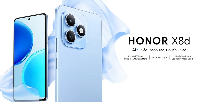 HONOR ngày 7-3-2026 đã chính thức trình làng tại thị trường Việt Nam sản phẩm HONOR X8d, smartphone sở hữu pin 7.000mAh mỏng nhất phân khúc. Thiết bị còn đạt chuẩn kháng nước IP65 cùng chứng nhận độ bền 5 sao từ SGS Thụy Sĩ, hướng đến xu hướng người dùng cần một chiếc điện thoại bền bỉ, dùng lâu dài.